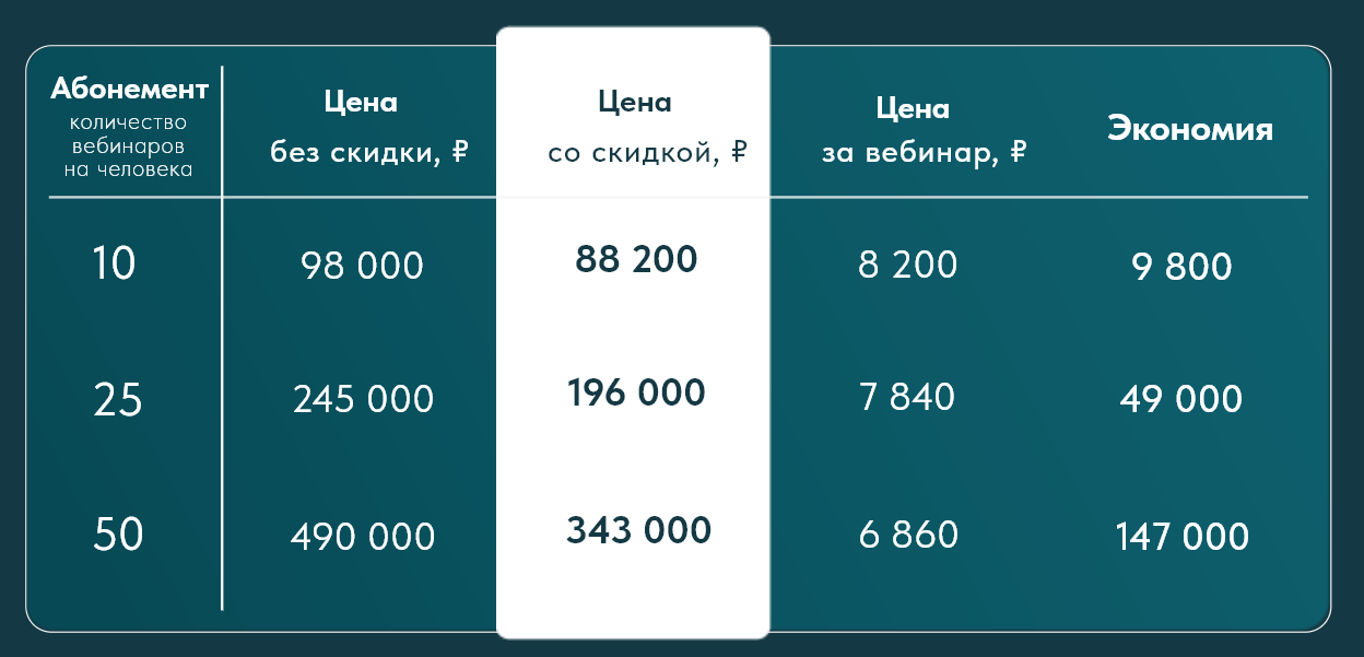 Для активных слушателей наших вебинаров, мы разработали систему абонементов. Это отличный способ сократить затраты на обучение.